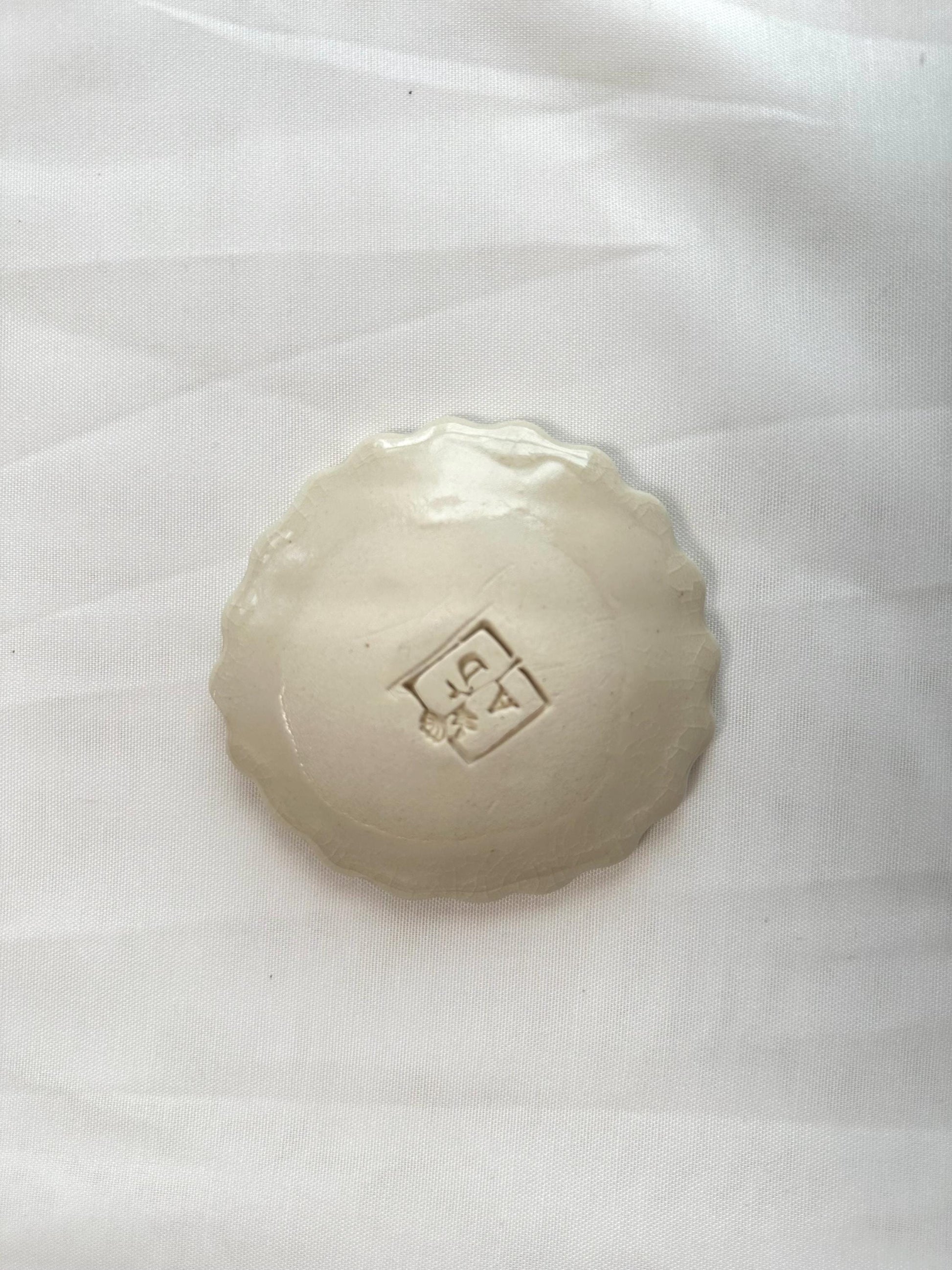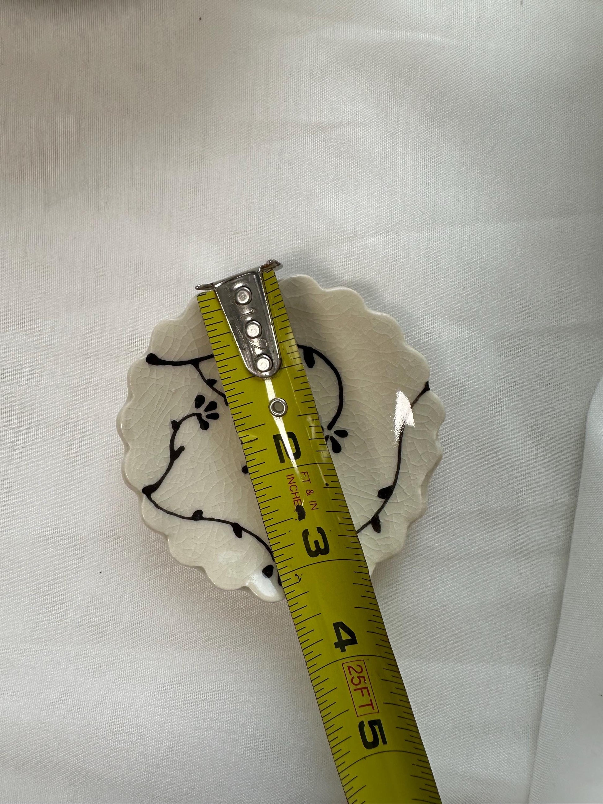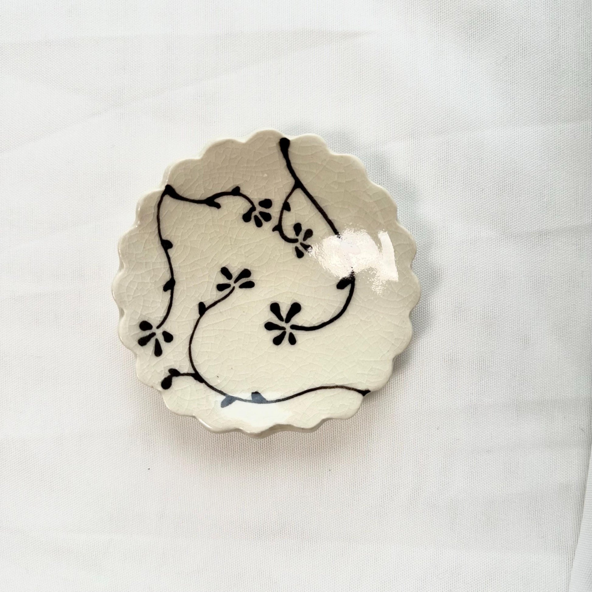 Shallow, scalloped bowl with handpainted brown underglaze and finished in a clear crackle glaze. 3”
