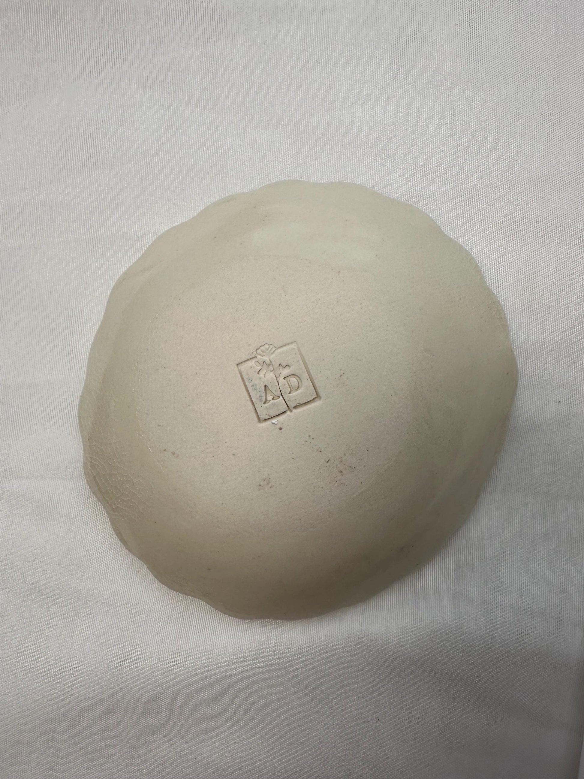 Shallow, scalloped bowl with handpainted blue underglaze and finished in a clear crackle glaze. 5”